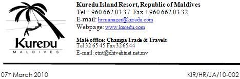 KUREDU ISLAND RESORT HAS THE FOLLOWING JOB VACANCY