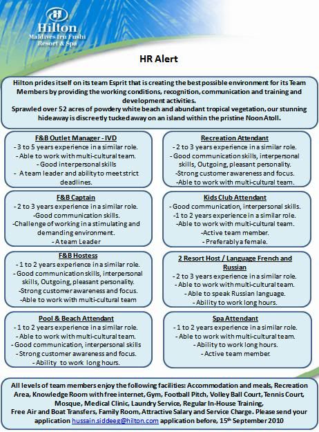 Job vacancies at HIlton Maldives Iru-Fushi resort & Spa