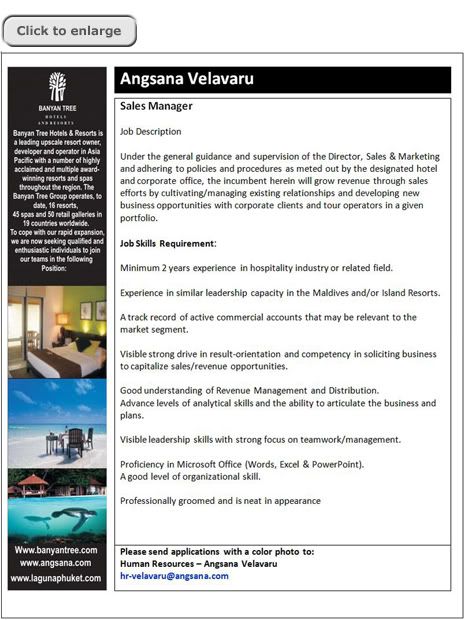 Job Opportunity for Sales Manager at Angsana Velavaru